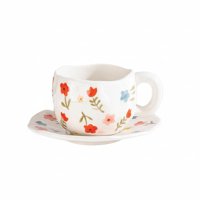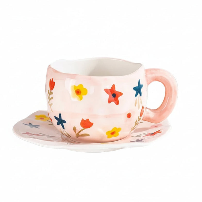 Add a soft, artistic touch to your daily coffee or tea routine with this hand-pinched ceramic mug. Designed with an irregular shape and finished with hand-painted flower and heart details, each mug has its own unique charm—no two pieces are exactly the same.